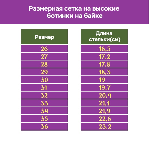 Данная модель ботинок выпускается с размерами от 27 до 36