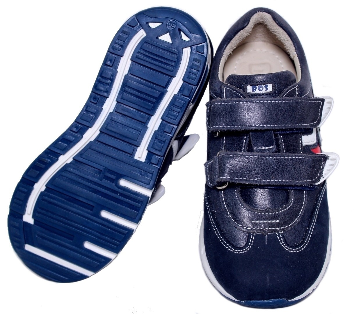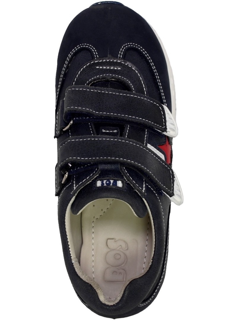 Фабрика BOS предлагает приобрести элегантные кроссовки для мальчика из синей кожи с декором в виде красной звезды.