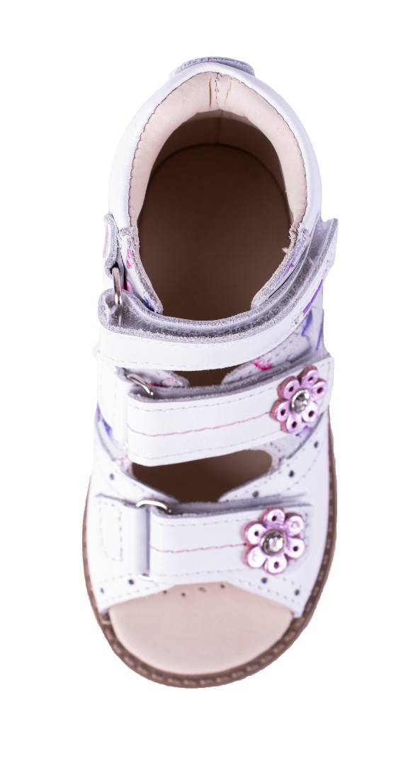 Ортопедические сандалии с высоким берцем для профилактики и коррекции плоскостопия и плосковальгусной установки стоп. Широкий, устойчивый каблук специальной конфигурации - каблук Томаса. Каблук продлен с внутренней стороны до середины стопы, чтобы исключить заваливание стопы вовнутрь, так называемая косолапость, или вальгусная деформация. Ребра жесткости до середины стопы, анатомическая стелька без супинатора, (возможна вкладка своей индивидуальной стельки) для правильного формирования свода стопы. Задник максимальной жесткости с удлиненным крылом надежно стабилизирует голеностопный сустав во время ходьбы. Упругая, умеренно-эластичная подошва, имеющая перекат, позволяет повторить естественное движение стопы при ходьбе для правильного распределения нагрузки на опорно-двигательный аппарат ребенка.