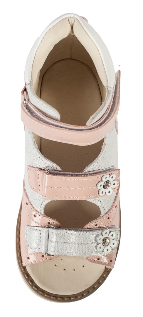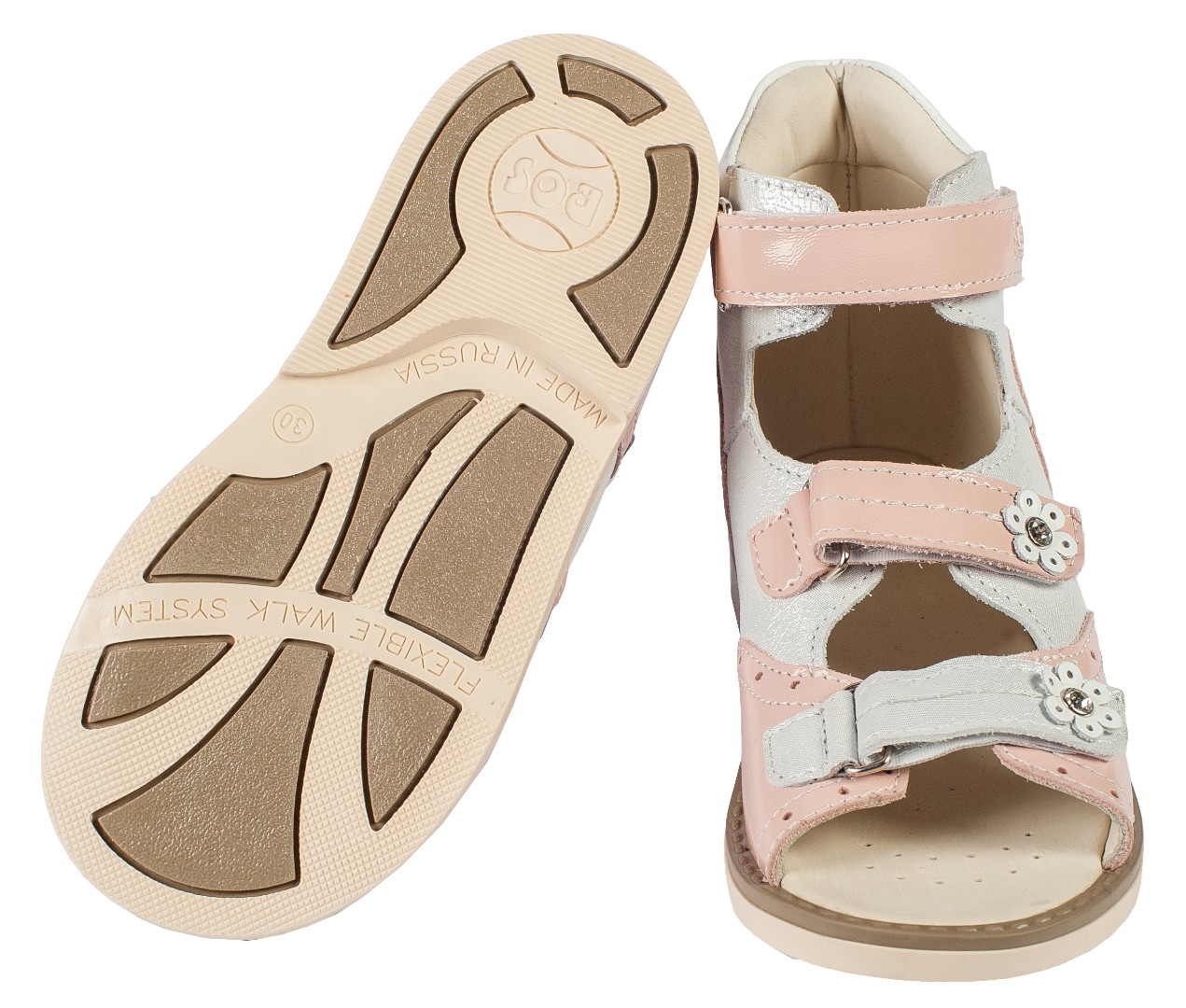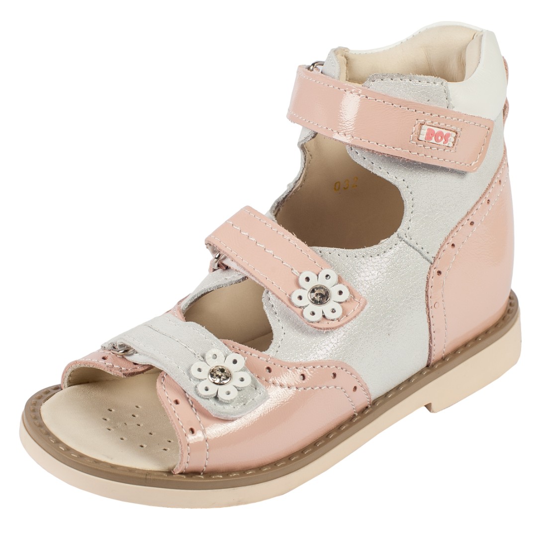 Ортопедические сандалии с высоким берцем для профилактики и коррекции плоскостопия и плосковальгусной установки стоп. Широкий, устойчивый каблук специальной конфигурации - каблук Томаса. Каблук продлен с внутренней стороны до середины стопы, чтобы исключить заваливание стопы вовнутрь, так называемая косолапость, или вальгусная деформация. Ребра жесткости до середины стопы, анатомическая стелька без супинатора, (возможна вкладка своей индивидуальной стельки) для правильного формирования свода стопы. Задник максимальной жесткости с удлиненным крылом надежно стабилизирует голеностопный сустав во время ходьбы. Упругая, умеренно-эластичная подошва, имеющая перекат, позволяет повторить естественное движение стопы при ходьбе для правильного распределения нагрузки на опорно-двигательный аппарат ребенка.