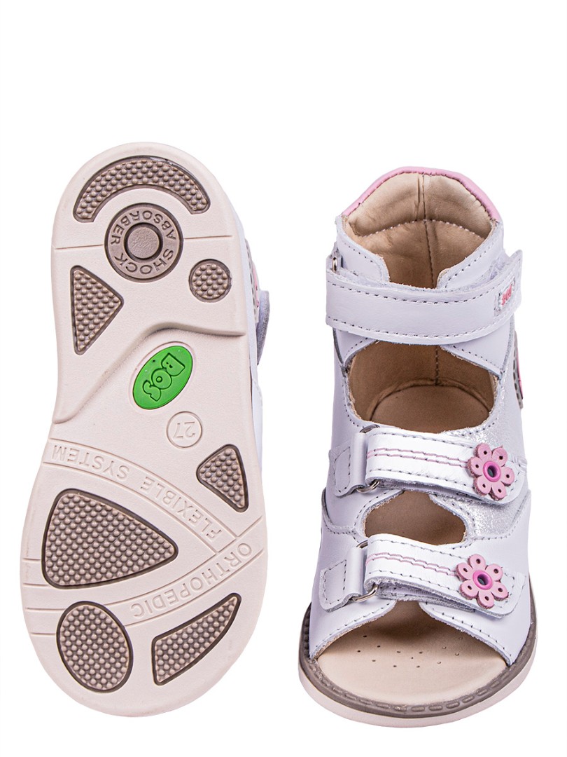 Ортопедические сандалии с высоким берцем для профилактики и коррекции плоскостопия и плосковальгусной установки стоп. Широкий, устойчивый каблук специальной конфигурации - каблук Томаса. Каблук продлен с внутренней стороны до середины стопы, чтобы исключить заваливание стопы вовнутрь, так называемая косолапость, или вальгусная деформация. Ребра жесткости до середины стопы, анатомическая стелька без супинатора, (возможна вкладка своей индивидуальной стельки) для правильного формирования свода стопы. Задник максимальной жесткости с удлиненным крылом надежно стабилизирует голеностопный сустав во время ходьбы. Упругая, умеренно-эластичная подошва, имеющая перекат, позволяет повторить естественное движение стопы при ходьбе для правильного распределения нагрузки на опорно-двигательный аппарат ребенка.