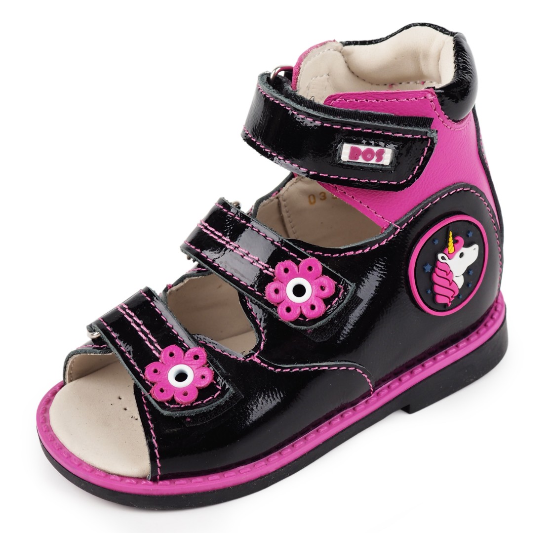 Ортопедические сандалии с высоким берцем для профилактики и коррекции плоскостопия и плосковальгусной установки стоп. Широкий, устойчивый каблук специальной конфигурации - каблук Томаса. Каблук продлен с внутренней стороны до середины стопы, чтобы исключить заваливание стопы вовнутрь, так называемая косолапость, или вальгусная деформация. Ребра жесткости до середины стопы, анатомическая стелька без супинатора, (возможна вкладка своей индивидуальной стельки) для правильного формирования свода стопы. Задник максимальной жесткости с удлиненным крылом надежно стабилизирует голеностопный сустав во время ходьбы. Упругая, умеренно-эластичная подошва, имеющая перекат, позволяет повторить естественное движение стопы при ходьбе для правильного распределения нагрузки на опорно-двигательный аппарат ребенка.