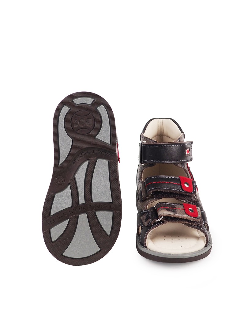 Сандалии для профилактики плоскостопия и плосковальгусной установки стоп. Широкий, устойчивый каблук специальной конфигурации - каблук Томаса. Каблук продлен с внутренней стороны до середины стопы, чтобы исключить заваливание стопы вовнутрь, так называемая косолапость, или вальгусная деформация. Анатомическая стелька с супинатором для правильного формирования свода стопы. Задник максимальной жесткости с удлиненным крылом надежно стабилизирует голеностопный сустав во время ходьбы. Упругая, умеренно-эластичная подошва, имеющая перекат, позволяет повторить естественное движение стопы при ходьбе для правильного распределения нагрузки на опорно-двигательный аппарат ребенка.