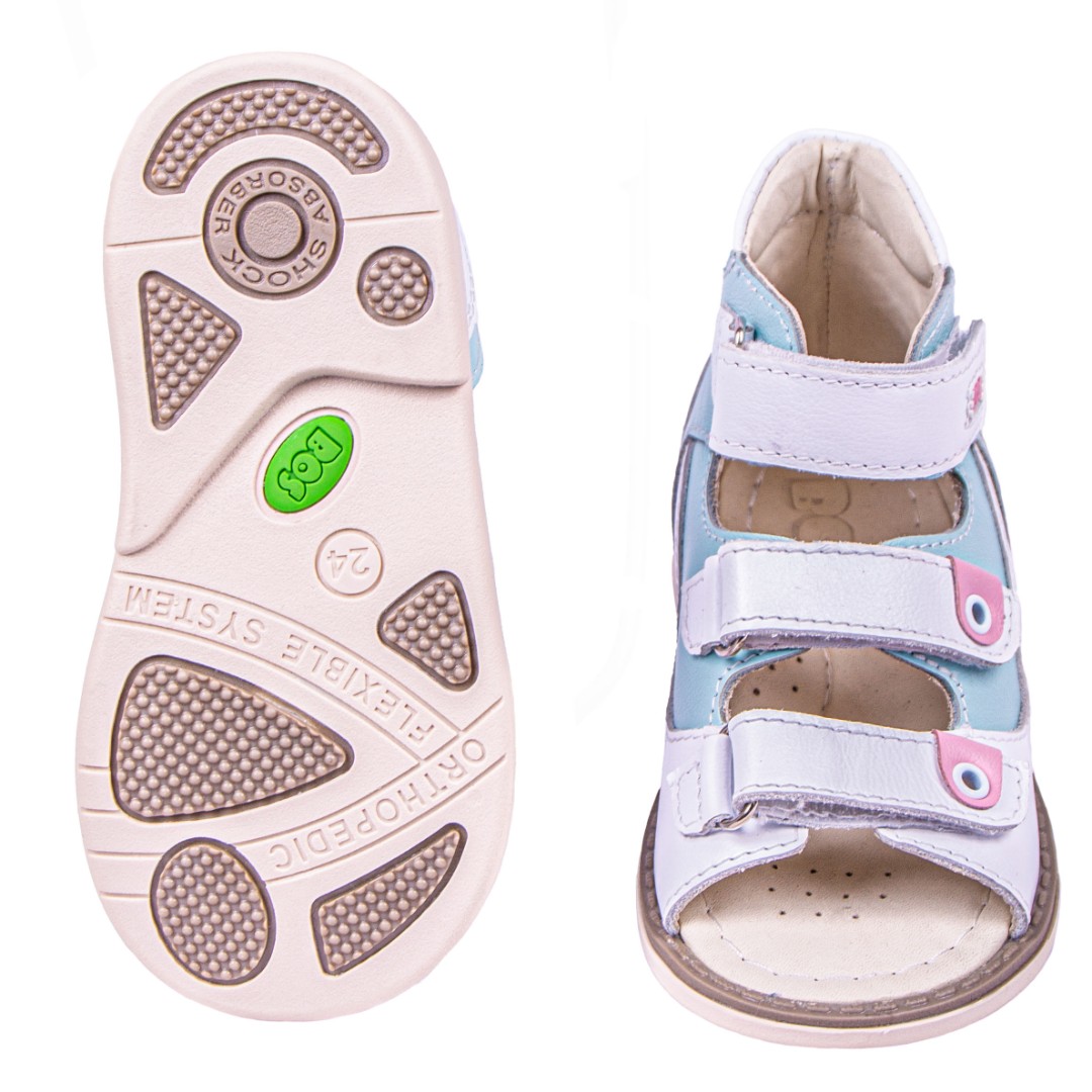 Ортопедические сандалии для профилактики и коррекции плоскостопия и плосковальгусной установки стоп. Широкий, устойчивый каблук специальной конфигурации - каблук Томаса. Каблук продлен с внутренней стороны до середины стопы, чтобы исключить заваливание стопы вовнутрь, так называемая косолапость, или вальгусная деформация. Анатомическая стелька с супинатором для правильного формирования свода стопы. Задник максимальной жесткости с удлиненным крылом надежно стабилизирует голеностопный сустав во время ходьбы. Упругая, умеренно-эластичная подошва, имеющая перекат, позволяет повторить естественное движение стопы при ходьбе для правильного распределения нагрузки на опорно-двигательный аппарат ребенка.