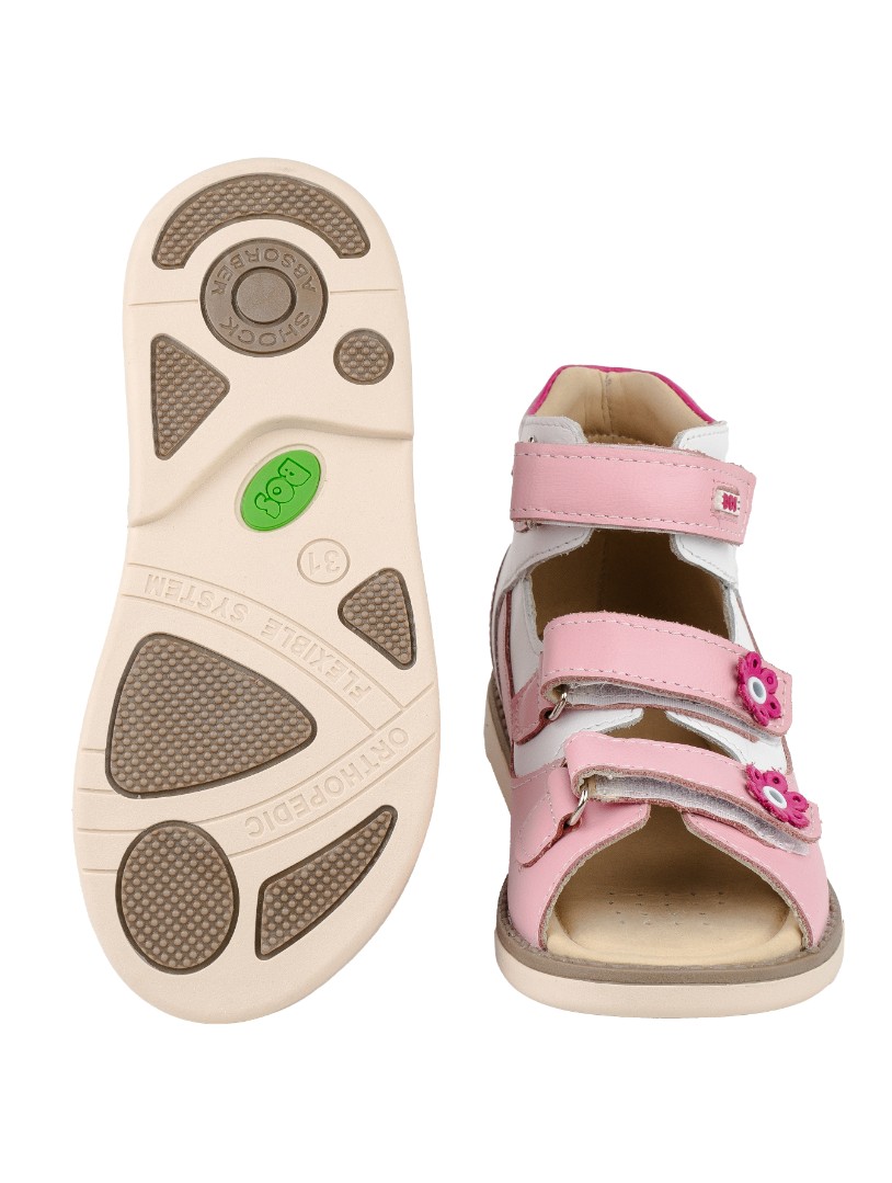 Ортопедические сандалии для профилактики и коррекции плоскостопия и плосковальгусной установки стоп. Широкий, устойчивый каблук специальной конфигурации - каблук Томаса. Каблук продлен с внутренней стороны до середины стопы, чтобы исключить заваливание стопы вовнутрь, так называемая косолапость, или вальгусная деформация. Анатомическая стелька с супинатором для правильного формирования свода стопы. Задник максимальной жесткости с удлиненным крылом надежно стабилизирует голеностопный сустав во время ходьбы. Упругая, умеренно-эластичная подошва, имеющая перекат, позволяет повторить естественное движение стопы при ходьбе для правильного распределения нагрузки на опорно-двигательный аппарат ребенка.