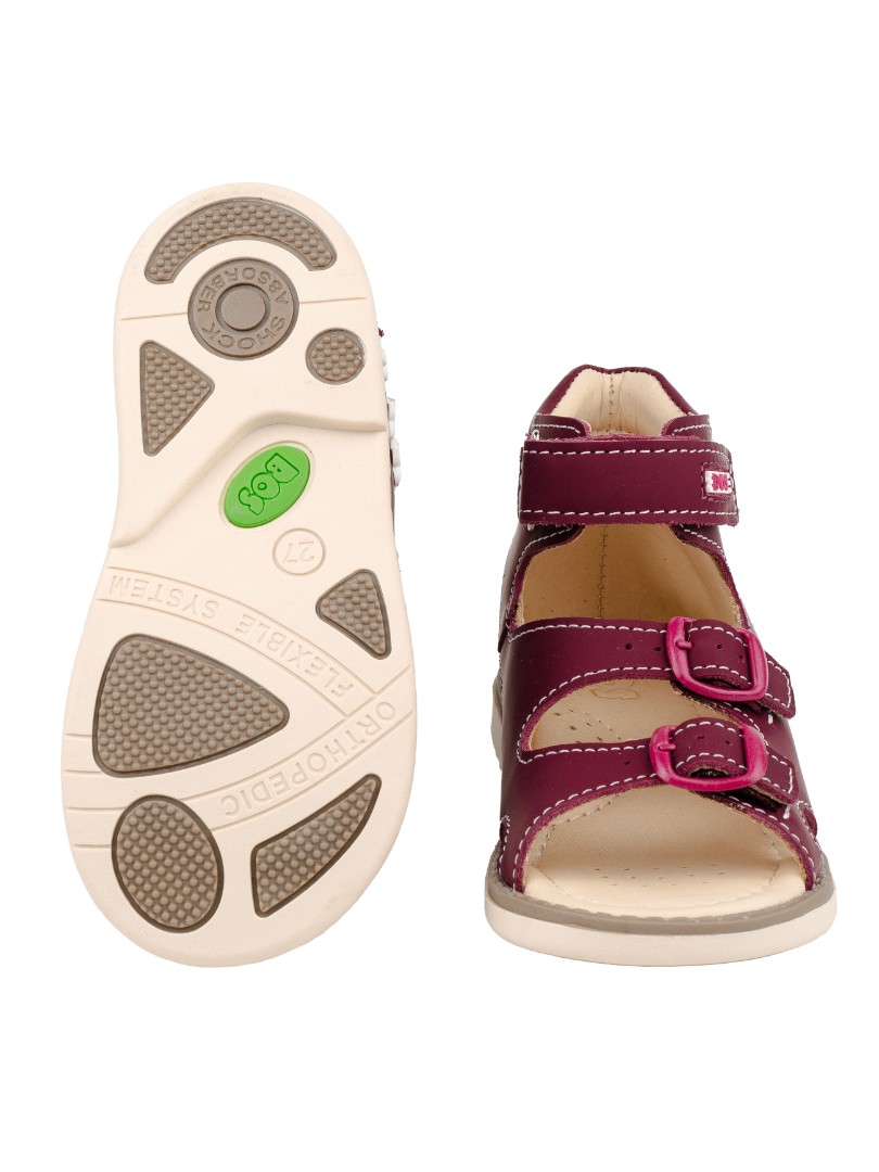 Ортопедические сандалии для профилактики и коррекции плоскостопия и плосковальгусной установки стоп. Широкий, устойчивый каблук специальной конфигурации - каблук Томаса. Каблук продлен с внутренней стороны до середины стопы, чтобы исключить заваливание стопы вовнутрь, так называемая косолапость, или вальгусная деформация. Анатомическая стелька с супинатором для правильного формирования свода стопы. Задник максимальной жесткости с удлиненным крылом надежно стабилизирует голеностопный сустав во время ходьбы. Упругая, умеренно-эластичная подошва, имеющая перекат, позволяет повторить естественное движение стопы при ходьбе для правильного распределения нагрузки на опорно-двигательный аппарат ребенка.