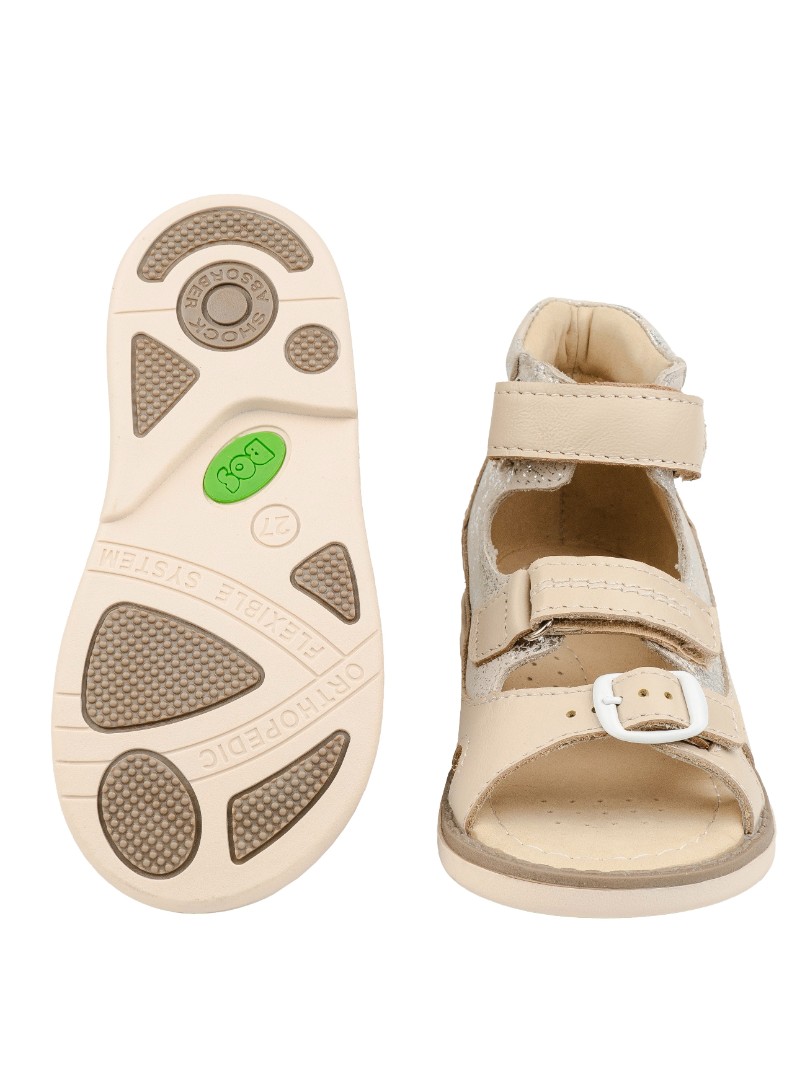 Ортопедические сандалии для профилактики и коррекции плоскостопия и плосковальгусной установки стоп. Широкий, устойчивый каблук специальной конфигурации - каблук Томаса. Каблук продлен с внутренней стороны до середины стопы, чтобы исключить заваливание стопы вовнутрь, так называемая косолапость, или вальгусная деформация. Анатомическая стелька с супинатором для правильного формирования свода стопы. Задник максимальной жесткости с удлиненным крылом надежно стабилизирует голеностопный сустав во время ходьбы. Упругая, умеренно-эластичная подошва, имеющая перекат, позволяет повторить естественное движение стопы при ходьбе для правильного распределения нагрузки на опорно-двигательный аппарат ребенка.