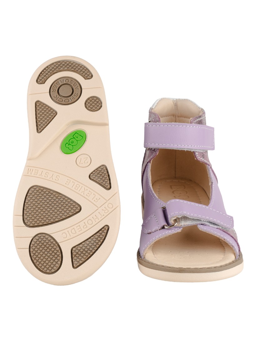 Ортопедические сандалии для профилактики и коррекции плоскостопия и плосковальгусной установки стоп. Широкий, устойчивый каблук специальной конфигурации - каблук Томаса. Каблук продлен с внутренней стороны до середины стопы, чтобы исключить заваливание стопы вовнутрь, так называемая косолапость, или вальгусная деформация. Анатомическая стелька с супинатором для правильного формирования свода стопы. Задник максимальной жесткости с удлиненным крылом надежно стабилизирует голеностопный сустав во время ходьбы. Упругая, умеренно-эластичная подошва, имеющая перекат, позволяет повторить естественное движение стопы при ходьбе для правильного распределения нагрузки на опорно-двигательный аппарат ребенка.