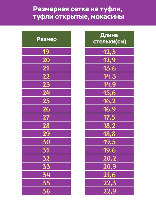 Данная модель туфель выпускается с размерами от 19 до 36