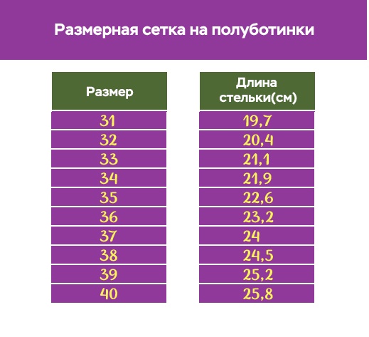Данная модель туфель выпускается с размерами от 36 до 40