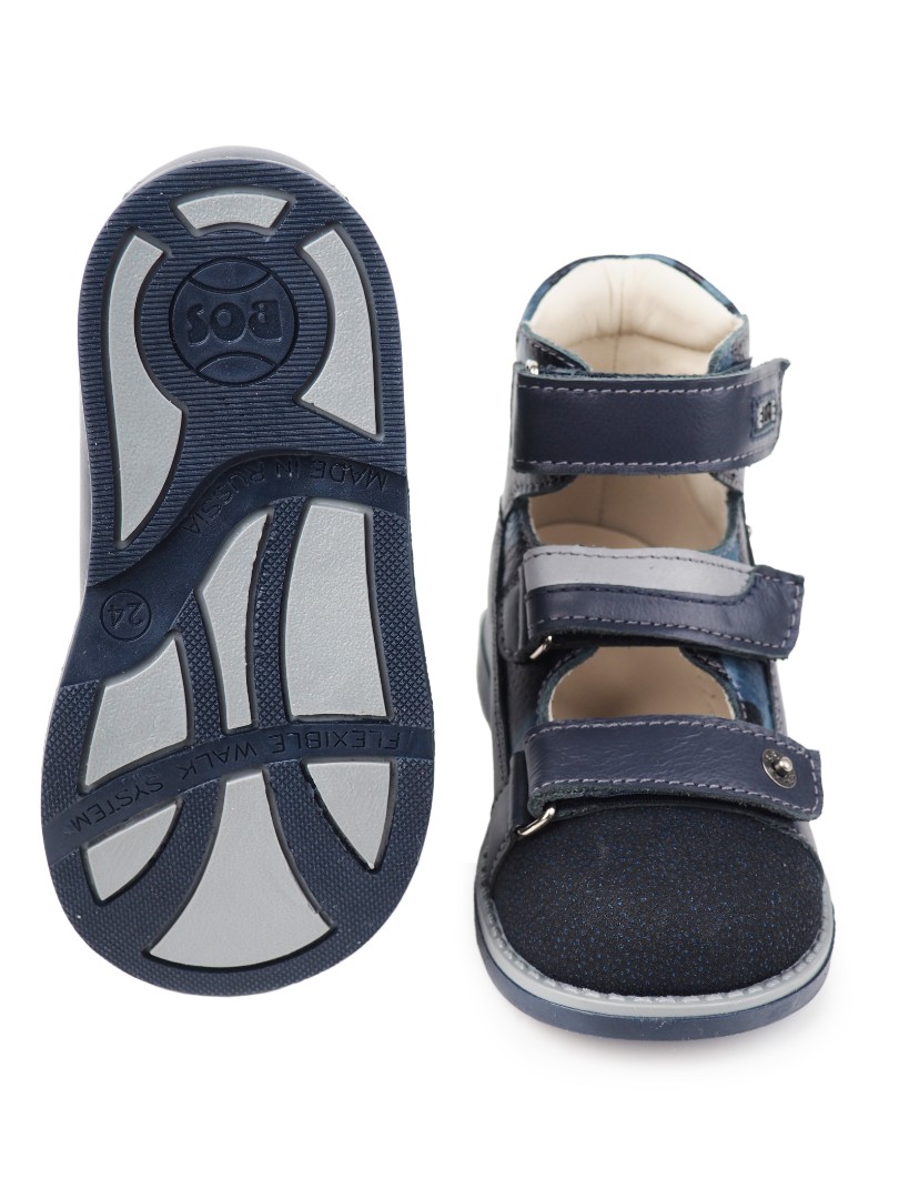 Ортопедические сандалии с высоким берцем для профилактики и коррекции плоскостопия и плосковальгусной установки стоп. Широкий, устойчивый каблук специальной конфигурации - каблук Томаса. Каблук продлен с внутренней стороны до середины стопы, чтобы исключить заваливание стопы вовнутрь, так называемая косолапость, или вальгусная деформация. Ребра жесткости до середины стопы, анатомическая стелька без супинатора, (возможна вкладка своей индивидуальной стельки) для правильного формирования свода стопы. Задник максимальной жесткости с удлиненным крылом надежно стабилизирует голеностопный сустав во время ходьбы. Упругая, умеренно-эластичная подошва, имеющая перекат, позволяет повторить естественное движение стопы при ходьбе для правильного распределения нагрузки на опорно-двигательный аппарат ребенка.